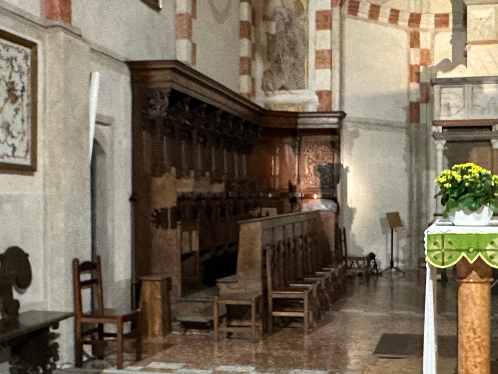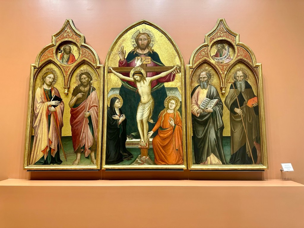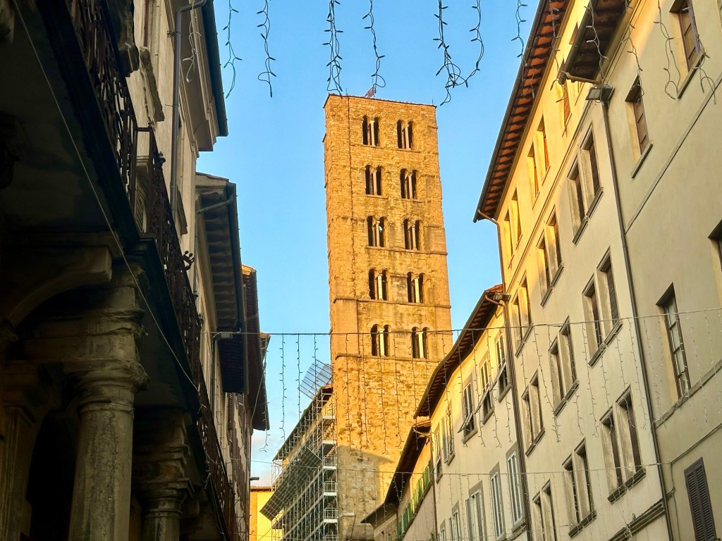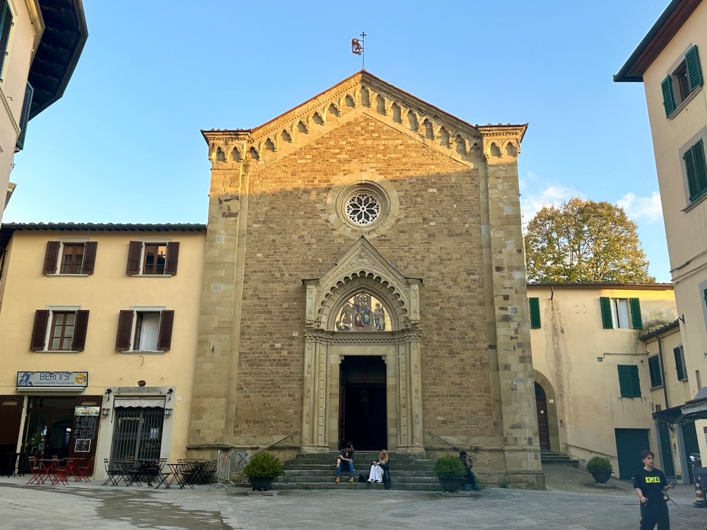 After the concert, it made sense to spend the last afternoon of the trip in Arezzo. Following a spectacular drive through the green Tuscan hills, with olive groves and Pines of Rome all around, I arrived at Arezzo and went to visit two churches that hold marvelous works of art. The first is the Basilica of San Domenico which has many historical frescos and paintings, and most notably the wooden cross made by Cimabue around 1267-71.