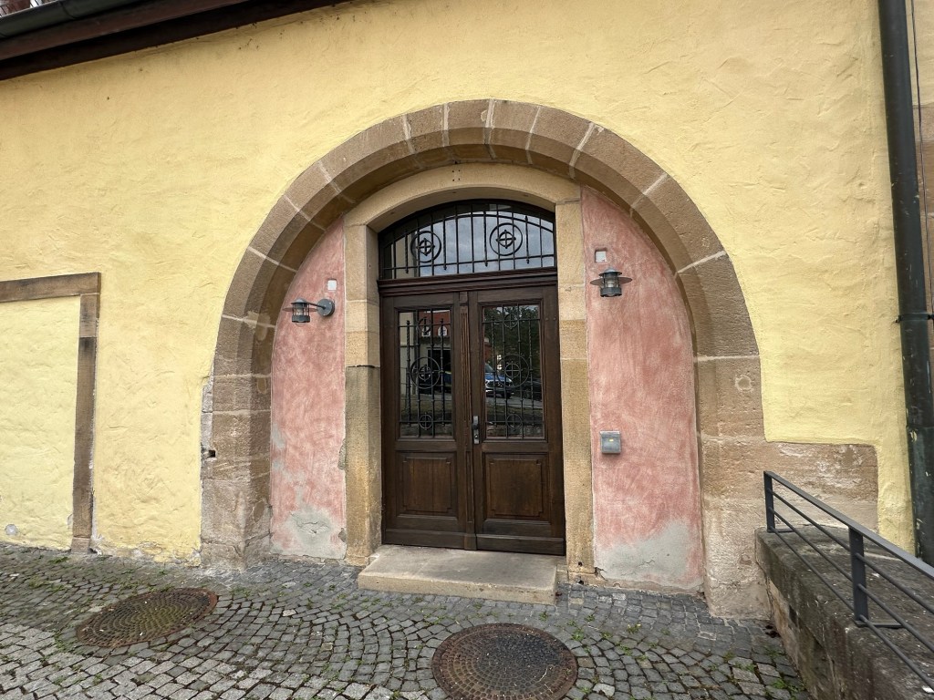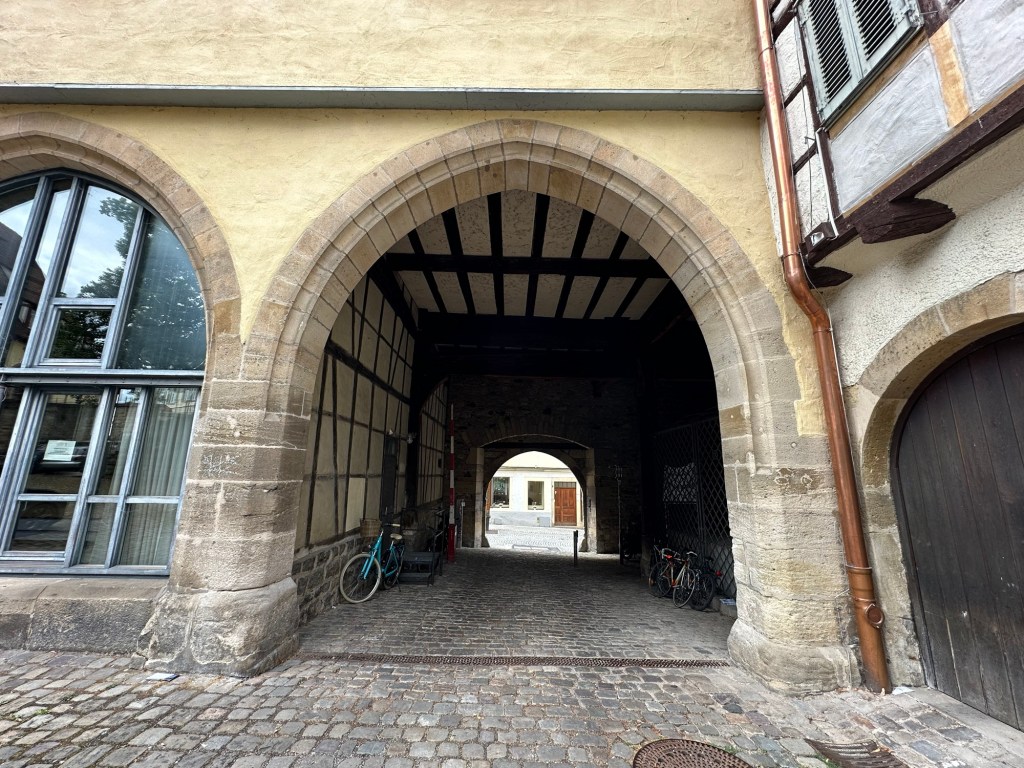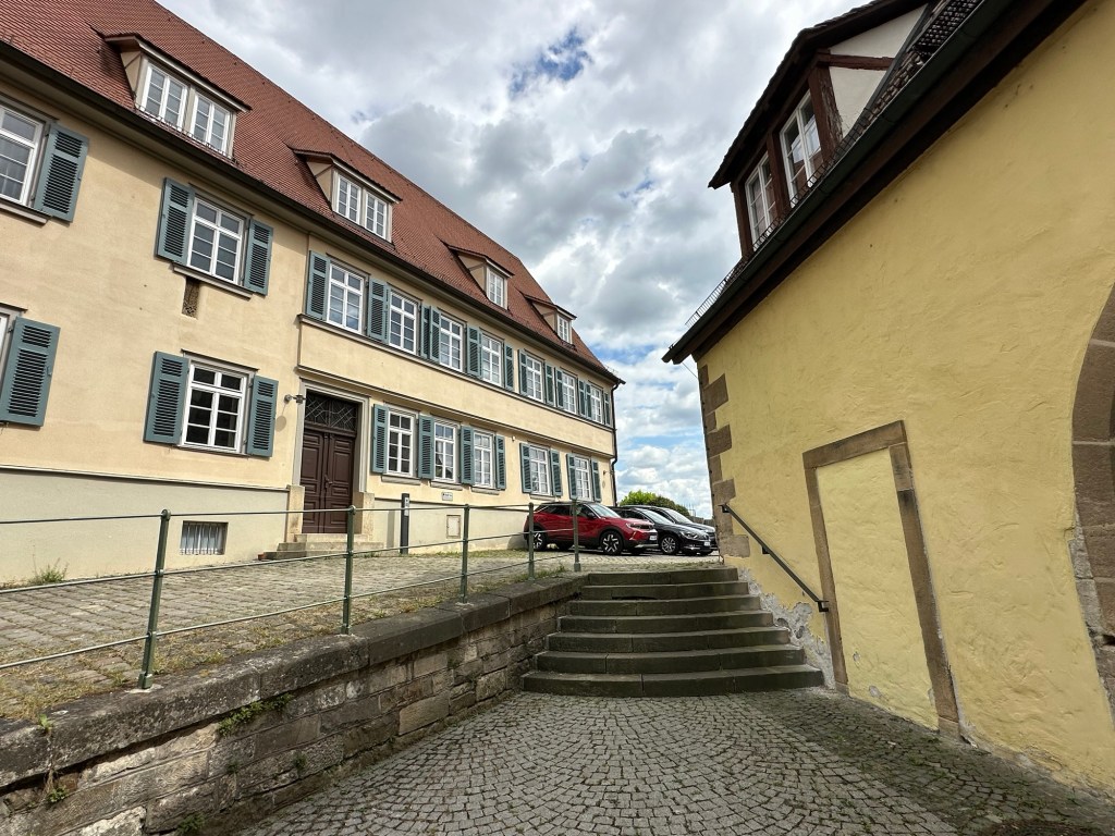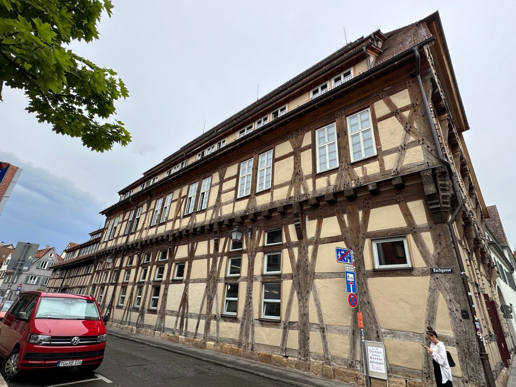 The music building dates from the 14th century and originally belonged to the nearby Bebenhausen monastery. In the 19th century, it housed the biggest winery in Tübingen (animal drawn carts entered through the huge arched doorways). Eventually, it became the music building of the University where they have classrooms, offices, a recital hall and an exhibition of historic instruments.