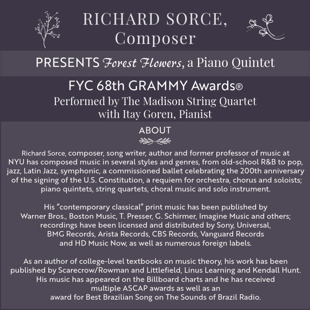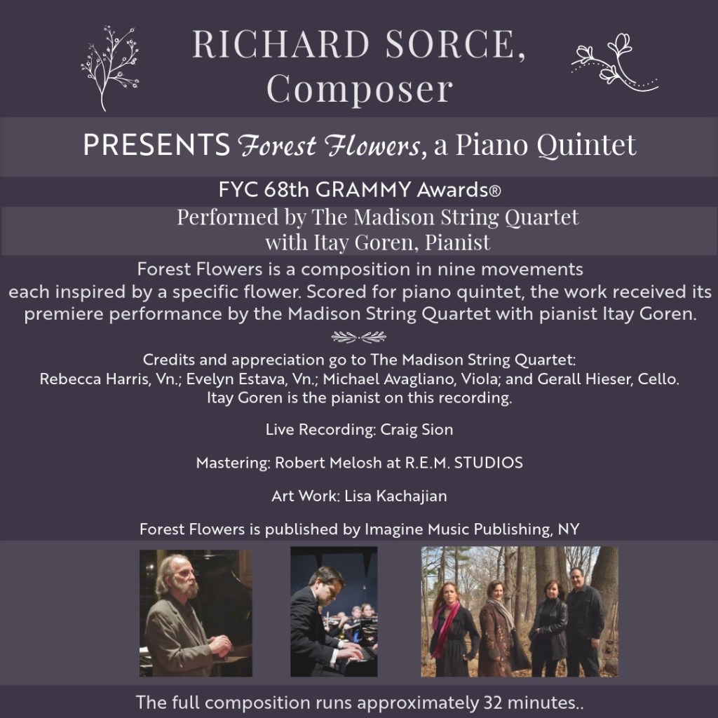 I hope you are well and have had a musically productive year. This year I have entered an original work in the Grammy “Best Contemporary Classical” category entitled, “Forest Flowers.” This is a composition for Piano Quintet featuring the Madison String Quartet with Pianist, Itay Goren. The piece is in nine movements, or more accurately, sections, each representing a particular flower, and with a total performance time of approximately 32 minutes. (Active links are at the end of this text). Although it is one continuous piece, each “movement” appears as a separate track. If you would consider listening I would be most appreciative…and, if you have a submission this year, I’m listening. (see FYC below).